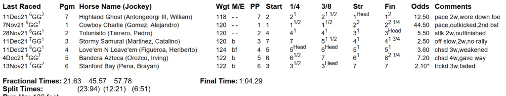 So after hours of crunching numbers and reading up on past winners, I know that Cowboy Charlie ran a decent race for his class. Racing folk pay attention to splits. How fast did they run the first quarter mile, how about the last quarter mile? Is that horse a closer? We know that 11 seconds is VERY good for a furlong, so a split close to 22 seconds is a burst of speed that cannot be maintained for long. Cowboy Charlie ran a 21.63 first split. So they started fast and then settled into the race. Very typical.