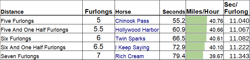 One seemingly helpful rule of thumb to give you a baseline is this: 12 seconds per furlong. Therefore, a decent pace for 5 furlongs is 60 seconds. My dad shared this nugget with me. If you are racing or working out at a rate slower than 12 seconds per furlong, then there may not be much excitement in your future. Here is a simple table to get started.